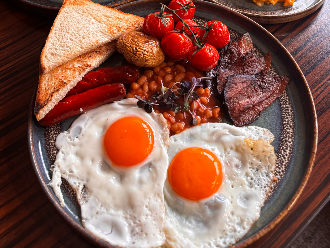 English Breakfast (paradicsomos bab, sült gomba, sült mini debreceni kolbász, tükörtojás, pirítós) 3 550 HUF
